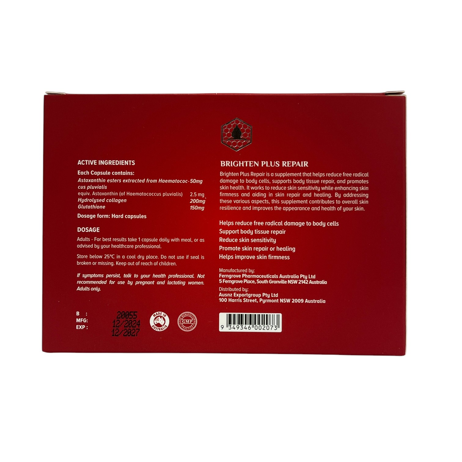 Gsense Brighten Plus Repair is a supplement that helps reduce free radical damage to body cells, supports body tissue repair, and promotes skin health. It works to reduce skin sensitivity while enhancing skin firmness and aiding in skin repair and healing. By addressing these various aspects, this supplement contributes to overall skin resilience and improves the appearance and health of your skin.